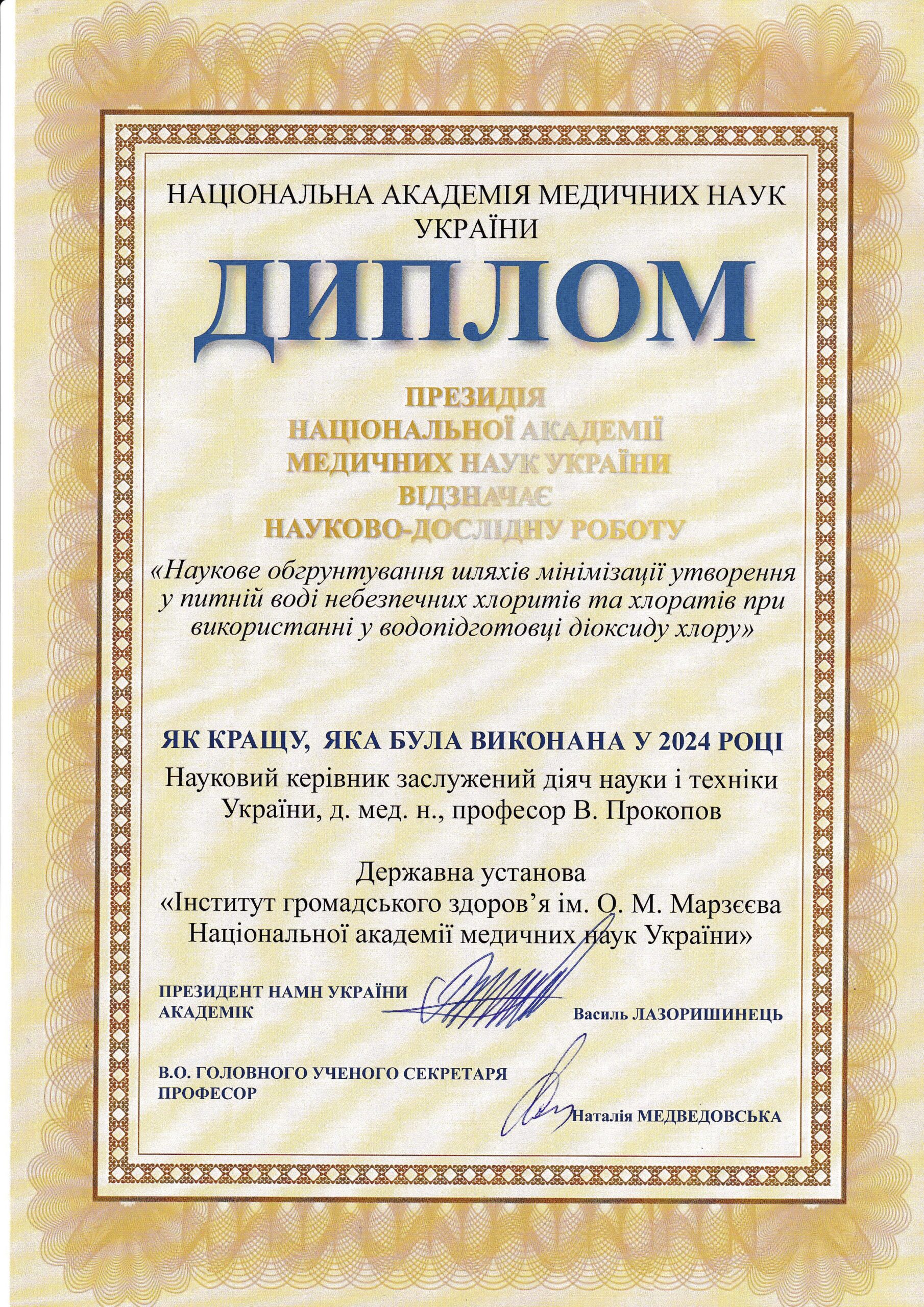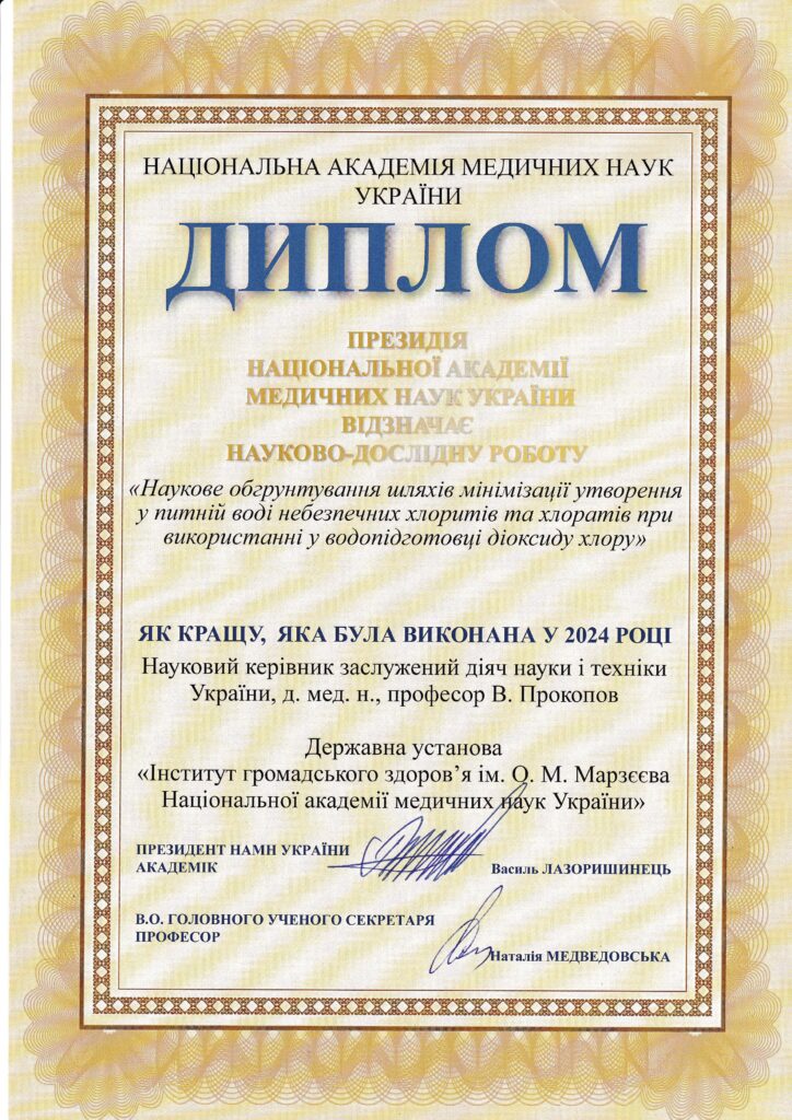 On October 5, 2025, the National Academy of Medical Sciences of Ukraine held an award ceremony for the best research projects completed in 2024, which were presented by the President of the National Academy of Medical Sciences of Ukraine, Academician Vasyl LAZORYSHYNETS. Our institute’s research project «SCIENTIFIC JUSTIFICATION OF WAYS TO MINIMIZE THE FORMATION OF HAZARDOUS CHLORITES AND CHLORATES IN DRINKING WATER WHEN USING CHLORINE DIOXIDE IN WATER TREATMENT,», which was carried out by the Laboratory of Natural and Drinking Water Hygiene together with the Laboratory of Biocides and Toxicology under the leadership of Honored Scientist of Ukraine, Doctor of Medical Sciences, Professor Viacheslav PROKOPOV.