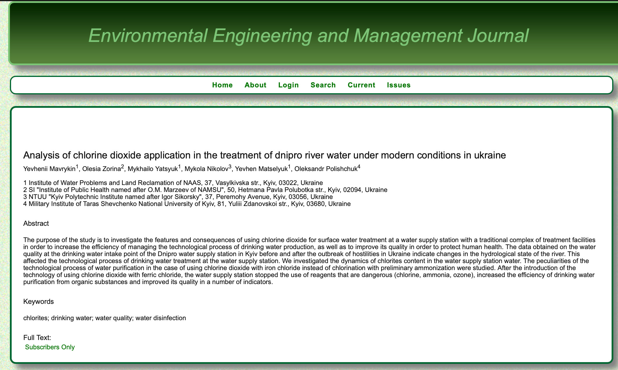 It has been found that the introduction of drinking water purification technology at the Dnipro Water Treatment Plant in Kyiv using chlorine dioxide with divalent iron chloride instead of chlorination with pre-ammoniation has made it possible to: reduce the number of reagents used (from 5 to 4) by eliminating the use of hazardous reagents (chlorine gas, ammonia, ozone); improve the quality of drinking water in terms of organoleptic indicators, aluminum, and organochlorine compounds; significantly increase the efficiency of water purification from organic substances (in terms of chemical oxygen demand – more than 2 times).