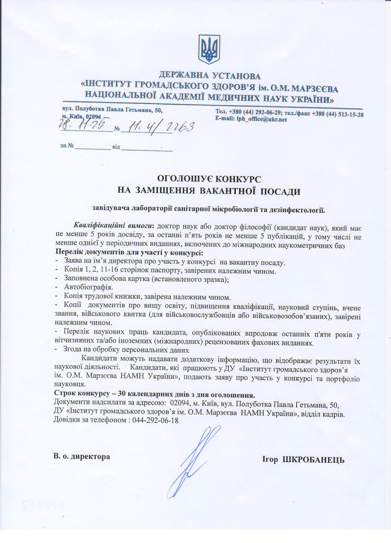 оголошує конкурс на заміщення вакантної посади завідувача лабораторії санітарної мікробіології та дезінфектології