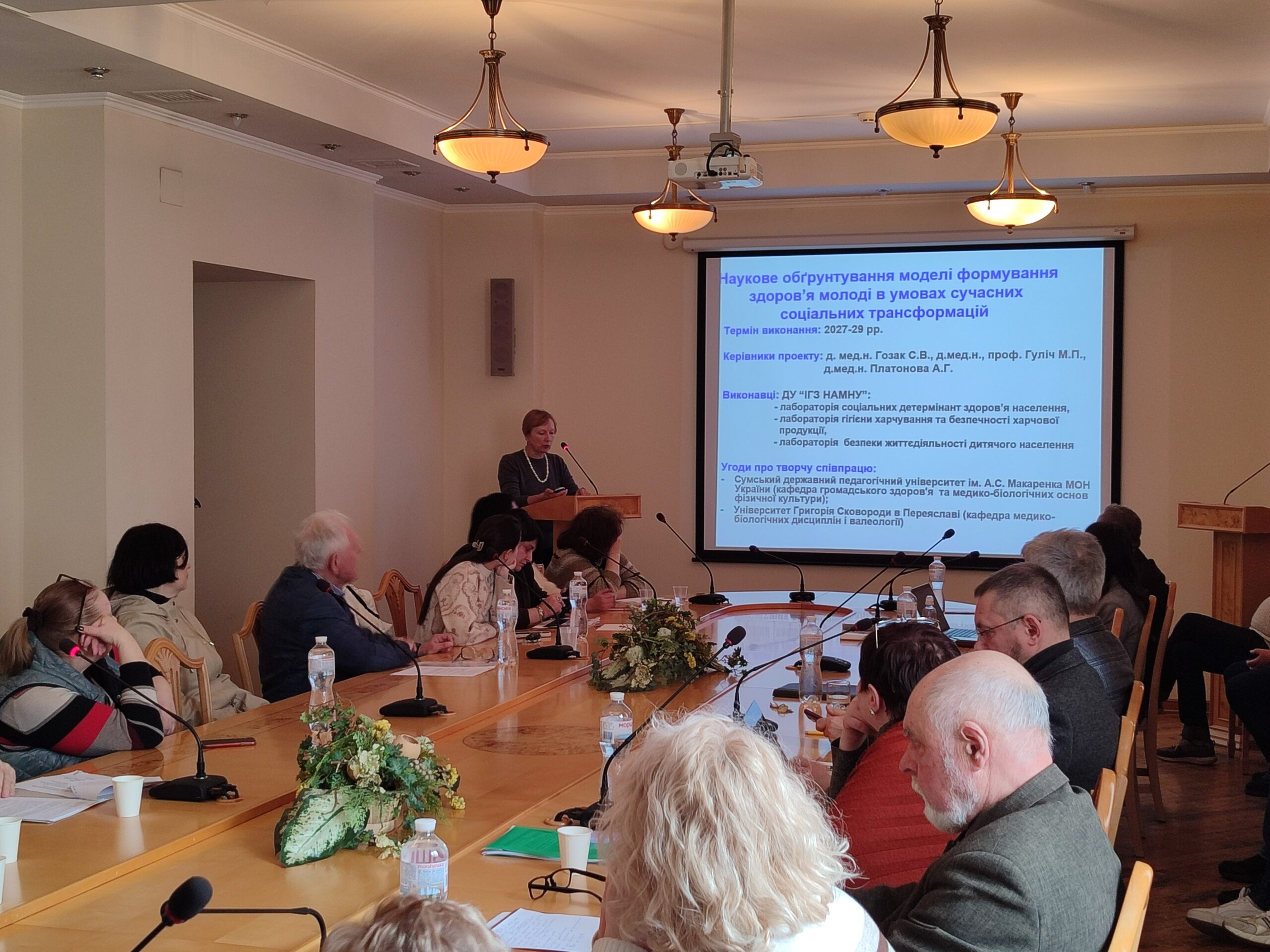 – д. мед. наук, с.н.с., зав. Лабораторії соціальних детермінант здоров’я населення Гозак С.В., яка доповіла про проєкт прикладної науково-дослідної роботи за темою «Наукове обґрунтування моделі формування здоров’я молоді в умовах сучасних соціальних трансформацій» (3 роки виконання). Мета проєкту: Вивчення закономірностей формування психічного та фізичного здоров’я молоді у контексті воєнних чинників, цифрової активності, фактичного харчування та харчової поведінки для наукового обґрунтування моделі формування здоров’я і вдосконалення профілактики неінфекційних захворювань. НДР виконуватиме муть спільно Лабораторія соціальних детермінант здоров’я населення, Лабораторія безпеки життєдіяльності дитячого населення та Лабораторія гігієни харчування та безпечності харчової продукції. Гозак С.В. докладно висвітлила актуальність, етапи виконання запланованої НДР, а також очікувані результати та форми впровадження проєкту. Заслухавши матеріали щодо оцінки проєкту та врахувавши актуальність теми, наукову новизну та практичну значущість, позитивні відгуки на проєкт НДР, після обговорення та відкритого голосування одноголосно ухвалили рішення: проєкт прикладної НДР «Наукове обґрунтування моделі формування здоров’я молоді в умовах сучасних соціальних трансформацій» рекомендувати на конкурс проєктів науково-дослідних робіт Президії Національної академії медичних наук України з терміном виконання 2027-2029 рр.