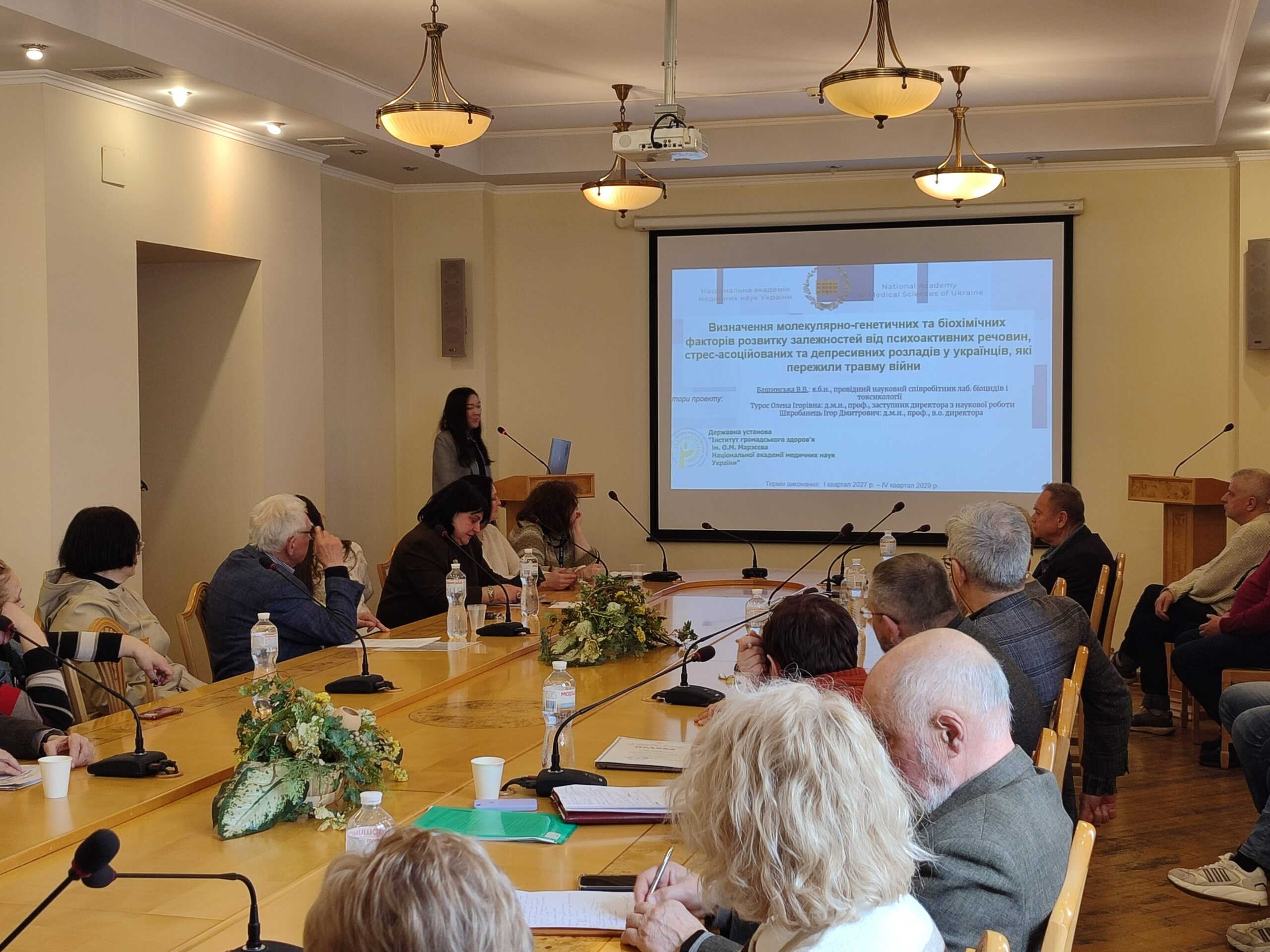 – к.б.н., провідний науковий співробітник лаб. біоцидів і токсикології Башинську В.В., яка доповіла про проєкт прикладної науково-дослідної роботи за темою «Визначення молекулярно-генетичних та біохімічних факторів розвитку залежностей від психоактивних речовин, стрес-асоційованих та депресивних розладів у українців, які пережили травму війни.» (3 роки виконання). В межах проєкту планується збільшення колекції ДНК людей з фенотипичною інформацією щодо вживання психоактивних речовин (ПАР), що проживають в Україні, а також створення колекції ДНК людей з посттравматичним стресовим розладом (ПТСР), іншими стрес-асоційованими розладами та депресією внаслідок війни. Окрім того, буде проведено анкетування людей стосовно того, як стрес війни впливає на вживання ПАР, ментальне і фізичне здоров’я, зокрема на взаємозв’язок важких ментальних наслідків війни (депресія, ПТСР, розлади адаптації) і вживання ПАР. Це дозволить зрозуміти причинні взаємозв’язки між різними порушеннями психічного і фізичного здоров’я внаслідок травматизуючого досвіду війни. Мета проєкту: Виявлення молекулярно-біологічних, зокрема генетичних та протеомних маркерів розвитку стрес-асоційованих, депресивних розладів, залежностей від психоактивних речовин (ПАР) у українців, які пережили травму війни. Башинська В.В.докладно висвітлила актуальність, етапи виконання запланованої НДР, а також очікувані результати та форми впровадження проєкту. Заслухавши матеріали щодо оцінки проєкту та врахувавши актуальність теми, наукову новизну та практичну значущість, позитивні відгуки на проєкт НДР, після обговорення та відкритого голосування одноголосно ухвалили рішення: проєкт прикладної НДР «Визначення молекулярно-генетичних та біохімічних факторів розвитку залежностей від психоактивних речовин, стрес-асоційованих та депресивних розладів у українців, які пережили травму війни» рекомендувати на конкурс проєктів науково-дослідних робіт Президії Національної академії медичних наук України з терміном виконання 2027-2029 рр.
