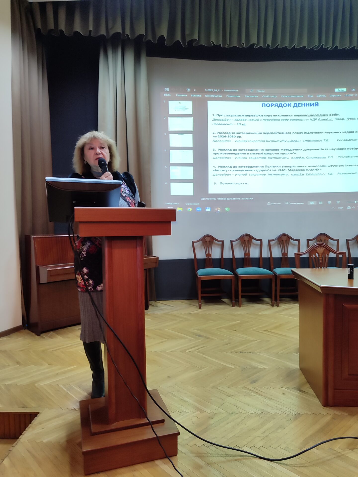- Про результати перевірки ходу виконання науково-дослідних робіт. Голова комісії по перевірці ходу виконання науково-дослідних робіт науковими підрозділами Інституту д.мед.н., проф. Олена ТУРОС доповіла про результати перевірки. Під час перевірки увага зверталась на виконання: технічного завдання до наукової роботи, дотримання календарного плану, наявність та якість оформлення первинної документації згідно з вимогами діловодства, стан засобів вимірювальної техніки, наявність нормативних та інформаційно-методичних розробок, підтвердження висвітлення отриманих результатів в інформаційному просторі (публікаційні матеріали, виступи на конференціях, проведення тематичних заходів). Результати перевірки засвідчують, що розглянуті НДР виконуються на високому науково-методичному рівні, згідно з затвердженими технічними завданнями з дотриманням календарного плану, результати впроваджуються в практику з виданням проєктів нормативних документів та інформаційно-методичних розробок.