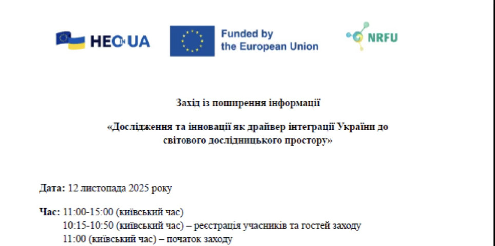 12 листопада 2025 року відбувся захід із поширення інформації «Дослідження та інновації як драйвер інтеграції України до світового дослідницького простору»