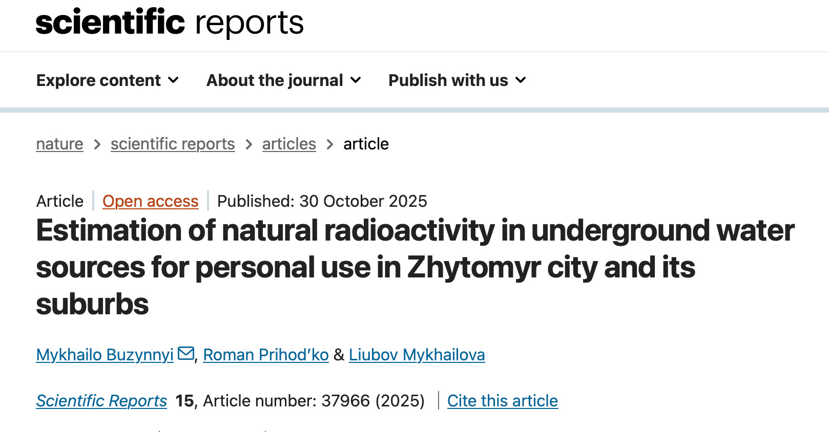 Посилання : Buzynnyi, M., Prihod’ko, R. & Mykhailova, L. Estimation of natural radioactivity in underground water sources for personal use in Zhytomyr city and its suburbs. Sci Rep 15, 37966 (2025). https://doi.org/10.1038/s41598-025-21813-w