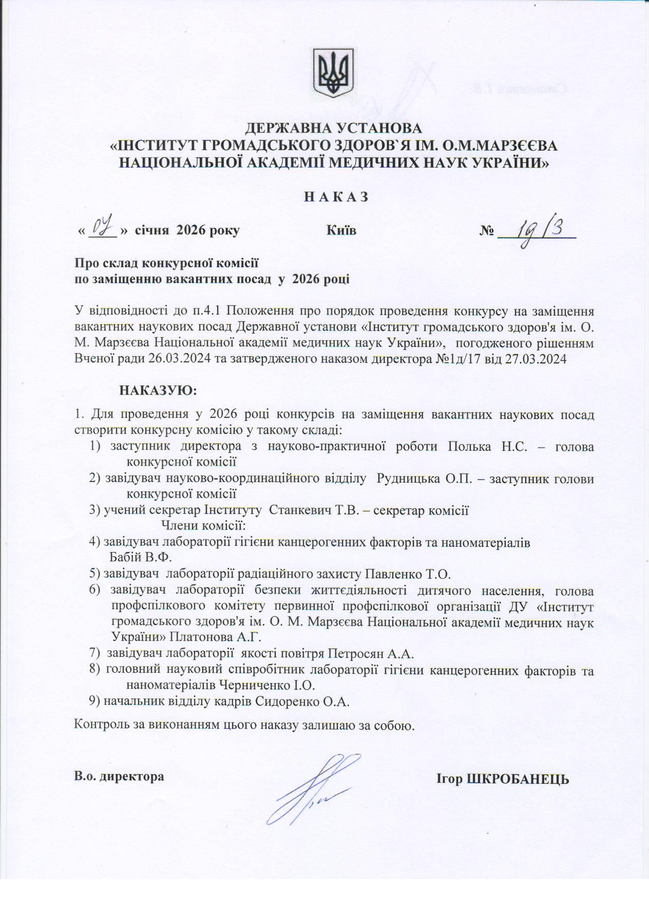 Склад Конкурсної комісії змінюється щорічно й у 2026 році визначається Наказом № 1д/3 від 07 січня 2026 року «Про склад конкурсної комісії по заміщенню вакантних посад у 2026 році» (завантажити).